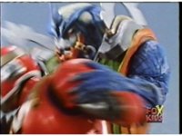 Repeat, closer, on Shogun Megazord slashing flaming blade of its Saber diagonally downward through the screen. |