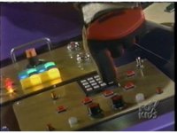 Downward close shot of Alpha's hand pressing multicolored lighted buttons. |