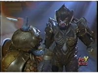Facing our right in front of throne, Lord Zedd spreads out arms, then punches right fist forth, lowering it slowly. |