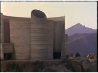 Pan down from the blue sky onto an upward angle on the Command Center exterior, the mountain beneath it dominating the shot. |