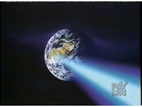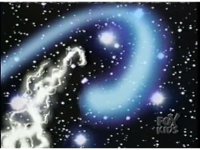 As background of cluster of stars in space slow zooms in to upper right, blue beam curves around and intersects a bolt of white lightning, canceling each other out. |