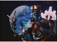 Slow zoom in over the rotating gearworks of the Machine Skybase onto King Mondo, who paces back and forth, talking, motioning his staff about, while Klank, Orbus, Prince Sprocket, and Queen Machina hang around to our left. |