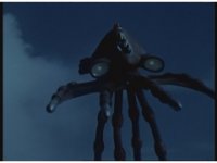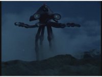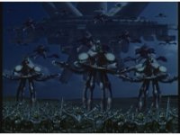 Close on Quadrafighters, flying to our left, two middle bent-legs glowing and then releasing energy-ring beam. |