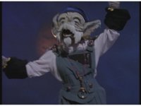 Close on King Mondo, talking to our slight left while motioning right hand, he then turns more toward us, raising and spreading arms, before turning to our right. |