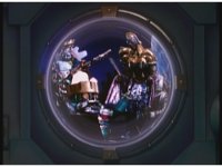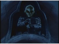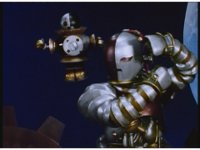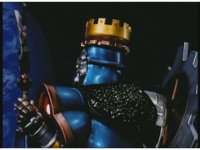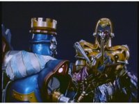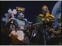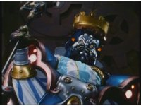 Slow zoom in from across the Skybase, as King Mondo turns around, heads to the center of the room, talking while some motioning of his hand and staff, eventually turning to our right. During this, Queen Machina turns away from her husband, fretting. Prince Sprocket covers his eyes and keeps away. Klank squats down and keeps low, covering his head, while Orbus remains attached to him. |