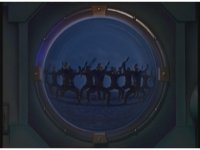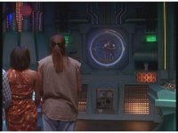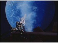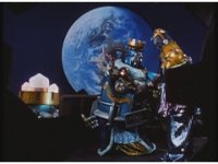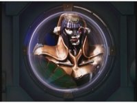 Slight zoom in on Queen Machina in front of Earth cut-out, talking to our right, then facing forward while some off-frame fan moving. |