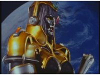 Earth cut-out in background, King Mondo turns from our left to our very slight right, talking a little while standing staff up. |