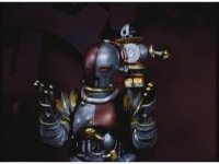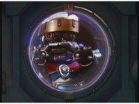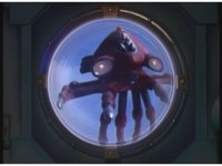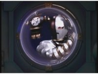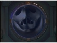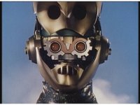 Close-up on Cog's face as its eye region slides up, exposing clockwork eyes. Cut to extreme close-up of its eyes as they flash with energy being released. |