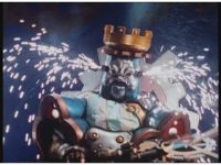 Zoom out from King Mondo, as steam rises from the top of his crown, and a shower of sparks spews from each ear, he yells and motions arms about, eyes soon flashing. |