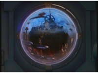 In Quadrafighter cockpit, the Cog pilot maintains a grip on the control stick, while leaning out to our left, looking down below. |