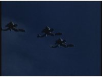 A trio of Quadrafighters fly in formation through the sky, turning to our left together. |