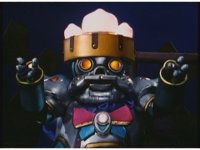 As King Mondo talks and motions staff while facing our left, Queen Machina behind him appears to laugh. As the royal couple turns to each other, Prince Sprocket comes waddling in from our left. |