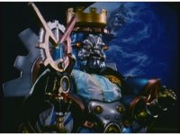 Zoom out from the clockworks of the Skybase wall, as King Mondo, Queen Machina, and Prince Sprocket step in from our left. Mondo motions staff about while talking, the others listening. |