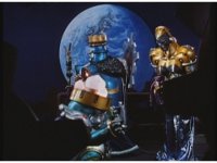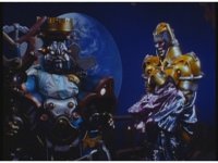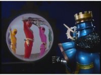 King Mondo watches the view screen on his left, as the Zeo Rangers pose victoriously. |