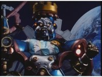 Klank & Orbus swiftly move out of frame to our right, as Mondo's staff smashes into pipe below the Earth cut-out, causing a steam leak to erupt. |