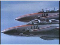 Close, side angle, on the fighter jets, one coming up alongside the other and keeping an exact pace, the pilots visibly moving about within. |