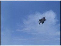 Upward angle, pan up as fighter jet soars through the sky right above and over us, passing over the Quadrafighter going the opposite direction. |
