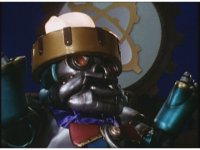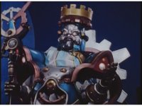 Slow zoom in on King Mondo, talking in front of the Royal House of Gadgetry crest on the view screen, as Klank, Orbus, Prince Sprocket, and Queen Machina watch their leader. |