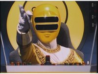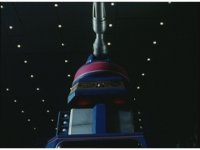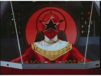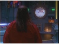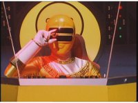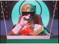 Beside the viewscreen, King Mondo talks, motioning hand and staff. Then slow zoom in on King Mondo's face, still talking, rising up and down and motioning arm and staff out of frame while doing so. |