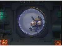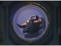 Close-up on Cog's face as its eye region slides up, exposing clockwork eyes. Cut to extreme close-up of its eyes as they flash with energy being released. |