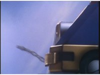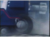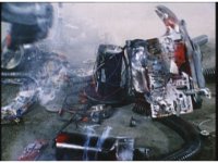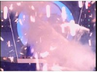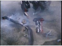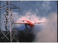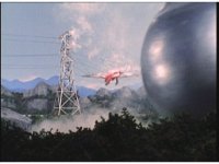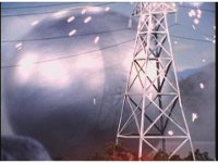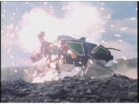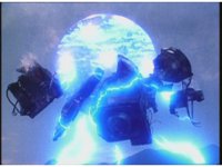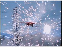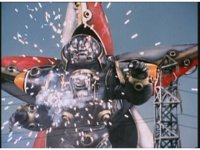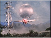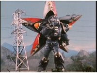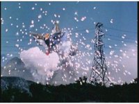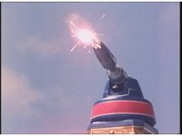 Close on Zeozord Five, hung up in the power lines, shaking up and down, while a cloud of dust wafts in from off-screen, causing the lines to start spark bursting again. |