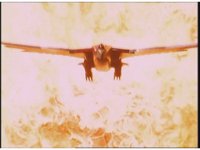 As flames lick the screen in the foreground, zoom in over the blaze, onto Zeo Megazord, as it raises saber, and slowly spreads arms, posing victoriously. |