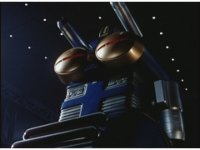 Close-up on Zeo Megazord's head as the Zeozord Five Battle Helmet slides down over it, flashing happening just off-frame. |