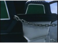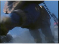 Close-up, side angle, on Zeozord Three as the chain attached to its back snaps off. |