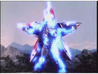 Close-up on Staroid's chest orb thing, as Zeo Megazord sparkily smashes it with a direct punch, knocking him back. |
