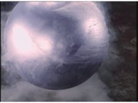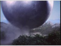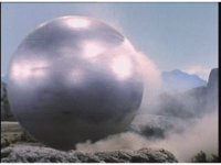 From the smoking pile of debris, rises a small, silver, metal ball. |