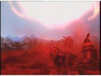 The flaming Staroid ball very slowly descends over the battlefield, above Zeozords One to Four, turning the scene red from the gas giant lighting cast from it. |