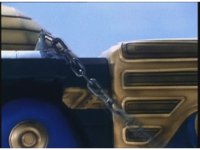 Close-up, side angle, on Zeozord Four as the chain attached to its back snaps off. |