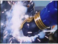 Close on Staroid, getting sparkily slashed by quickly-passing Saber, causing him to jerk about. |