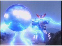 Zoom out from Zeo Megazord, as it reacts to the rising ball, which gleams with a bluish light and grows to its giant form, releasing electricity onto the ground below. |
