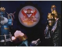King Mondo, Prince Sprocket, and Queen Machina watch Zeo Megazord posing victoriously through the flames on the viewscreen. |