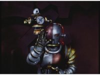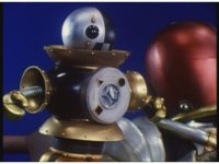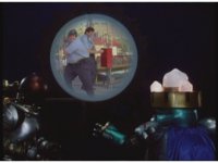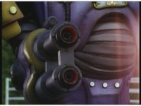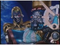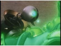 Close on Orbus, extending his neck then his robo-proboscis, spewing greenish energy upon People Pitcher. |