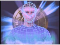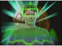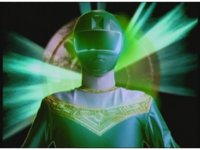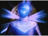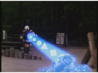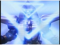 Close on Zeo Megazord motioning arms, and emitting multiple blue triangle energy beams from its forehead. |