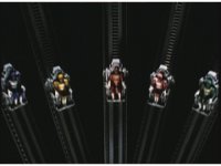 Inside the dark void of the Megazord interior, the five Zeo Rangers ride down to a common point on their escalator chairs. |