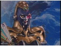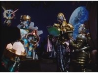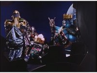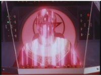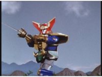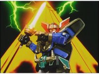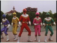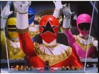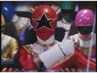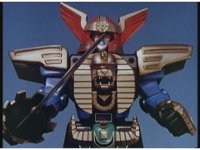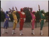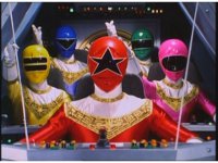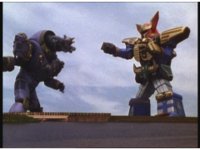 Zoom out from Red in Megazord cockpit, raising his right fist, nod-talking. Then, all together, the five Zeo Rangers cross their wrists, spread arms around in a circle and raise their right arms forth and up for a moment, before grabbing controls. |