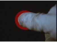 Close-up of Red Zeo Ranger's gloved hand pressing the red, jolly, candy-like button. |