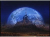 Far exterior of the Machine Empire Skybase against the profile of the Earth. In the distance, Gearships hovering about, exhaust pipes spewing balls of fire into the atmosphere. |