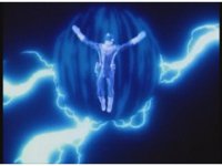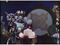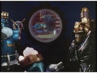 A constant blue beam from Zeo Megazord's helmet causes People Pitcher to lift up off the ground, encased in a briefly visible force field, struggling futilely as he's lifted up and down repeatedly. |