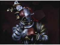 Close-up on Orbus in front of clockwork-wall, motioning body in a brief bit of talking. |
