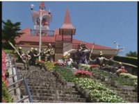 Distant shot of Yellow rushing onto the scene, meeting with Red, Green, and Pink at the bottom of a series of outdoor steps. |