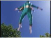Upward shot of Green Ranger diving whole body across the sky over us. |