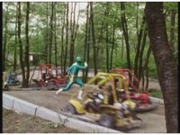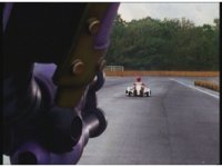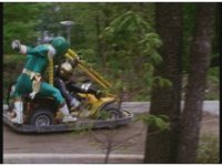Green Ranger finds himself in the middle of a go-cart race track, Cogs on go-carts speeding past him from both directions. |
