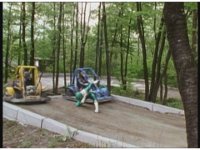 Giant People Pitcher gets up and approaches wooded, mountainous, wobbly model and looms over it. |