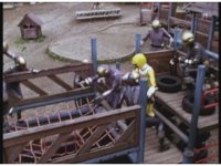 Distant side angle as People Pitcher faces Zeo Megazord, with the race track below them. |