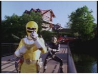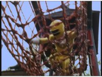 Yellow Ranger flips through the air, grabbing thrown Zeonizer as she passes near a tree. |