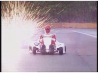 Side shot of Red on race cart speeding to our left through a rapid bursting of sparks. |